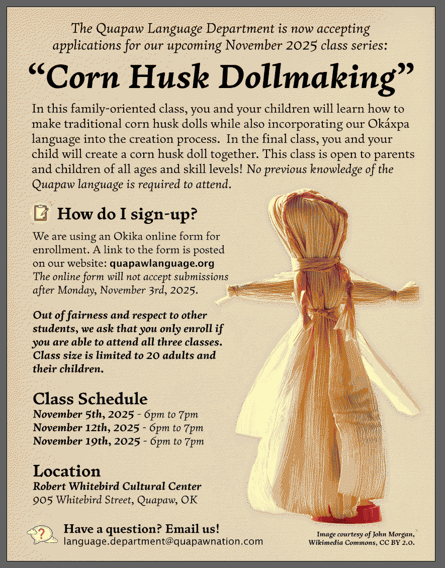 Welcome to the official homepage of the Quapaw Nation Language Department. Our site serves as the de facto home for Quapaw language resources such as learning materials and curriculum, historical documents, as well as our Okáxpa dictionary.