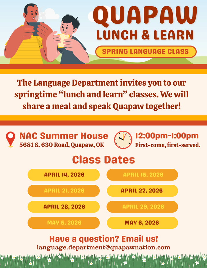 Our springtime in-person class series is set to begin this week. Class meets twice per week and each session is an hour. We will share a meal together over the lunch hour while we learn and speak Quapaw together. The meal will be provided by the Language Department. However, food is first-come, first-served, so don't be late!